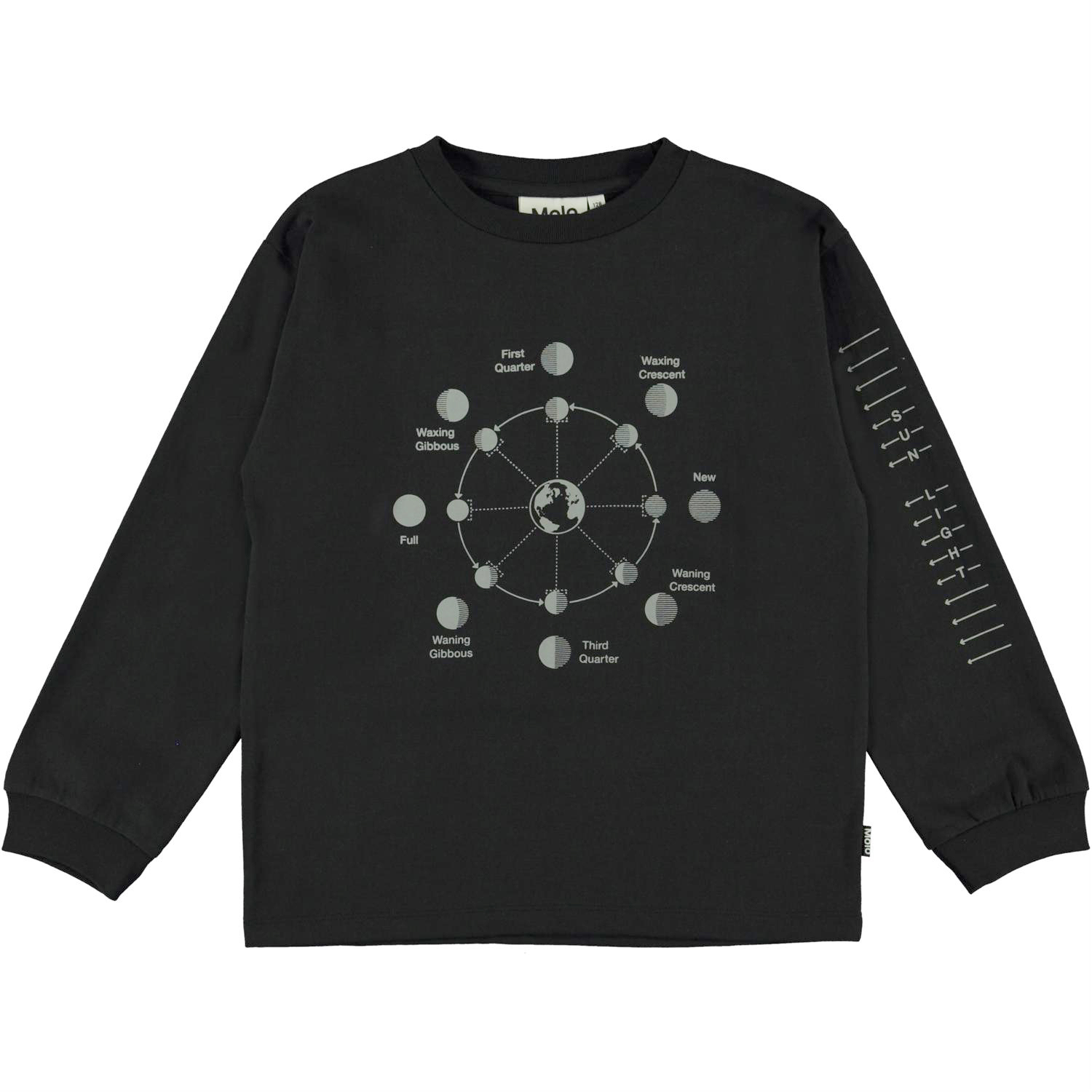 Rin är en svart långärmad t-shirt med ett print av månans alla faser på framsidan, samt ett print på ena ärmen. Printet är tryckt med reflex, som lyser i mörkret.