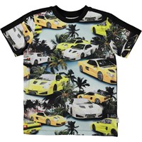 Rishi är en t-shirt med snabba bilar och palmer med en ljusblå bakgrund.