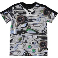 Delarna av en motorcykel skapar all-over trycket på t-shirten Rishi. Se om du kan hitta alla delarna. Rishi har svart baksida och halsringning.