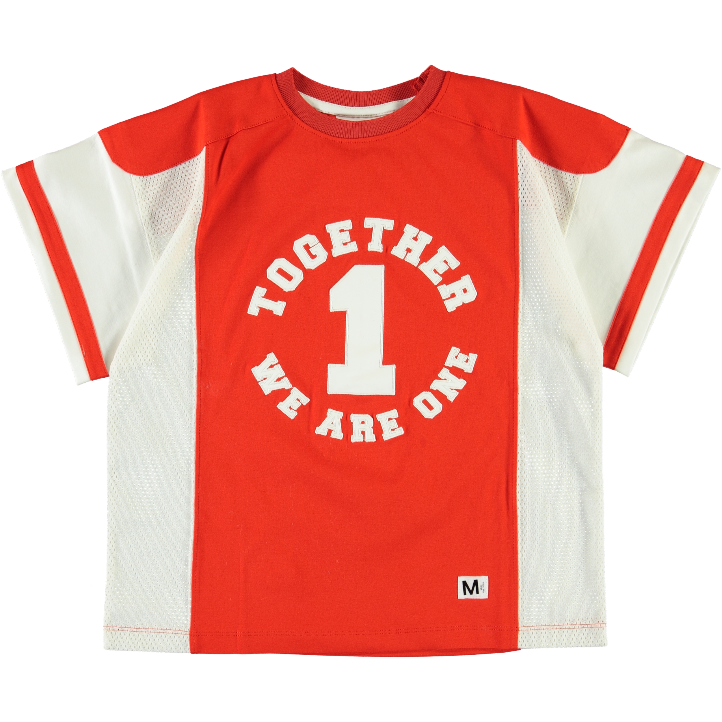 Ritter är en röd och vit t-shirt med sportreferenser. Ritter har en bred och lös passform med trycket "Together we are 1" framtill.