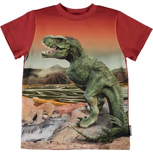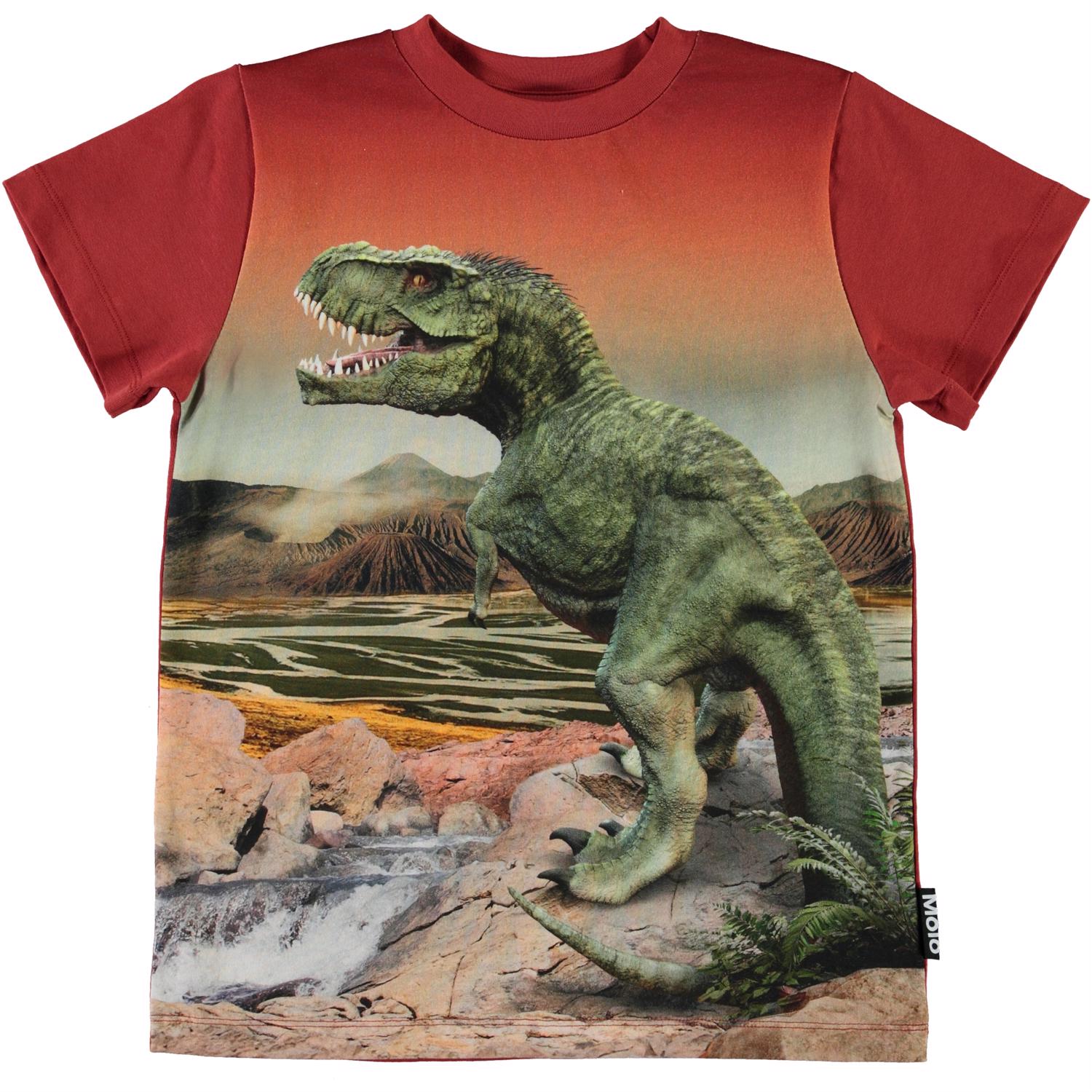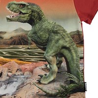 Road är en mörkgrå t-shirt med ett verkligt tryck av en t-rex dinosaurie och ett landskap i bakgrunden.