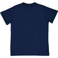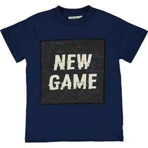 Road är en blå t-shirt med korta ärmar och påsydda print med texten 'New Game'.