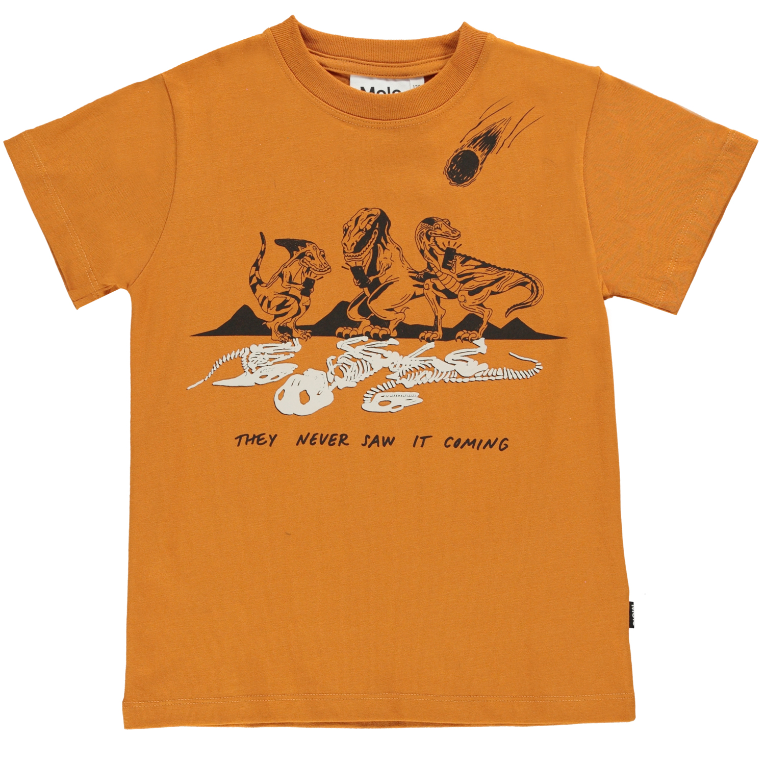 Road är en gyllene orange t-shirt med en humoristisk bild där dinosaurier tar bilder av sina skelett, medan en meteor är på väg mot dem.