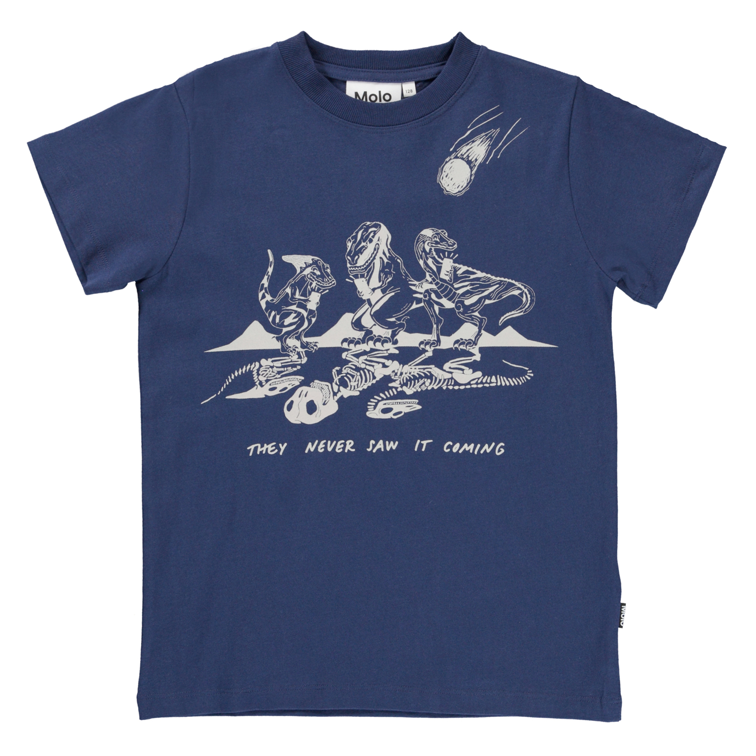 Road är en blå t-shirt med en humoristisk bild där dinosaurier som tar bilder av sina skelett, medan en meteor är på väg mot dem.