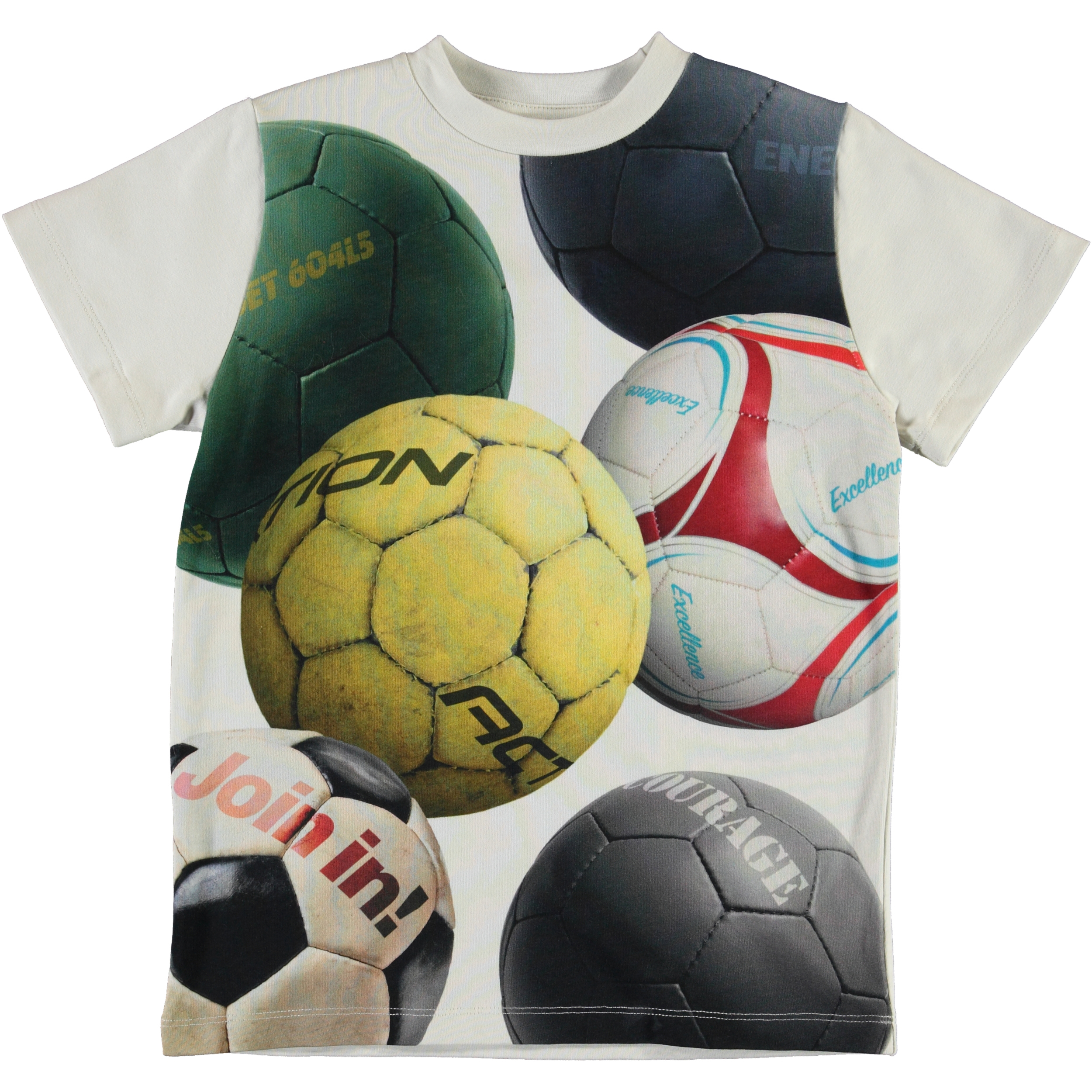 Road är en vit t-shirt med färgstarka fotbollar på framsidan av tröjan.