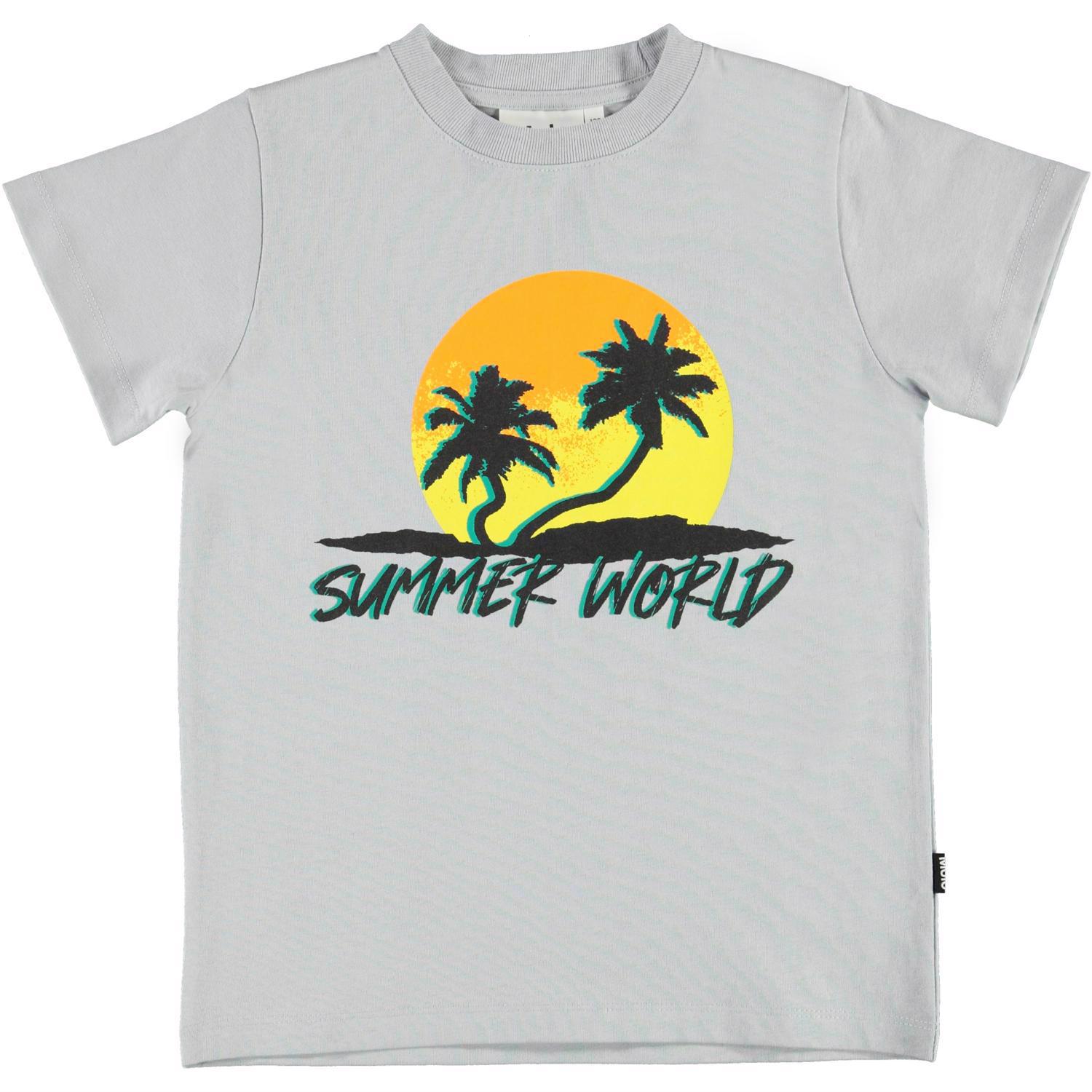 Road är en grå T-shirt med palmer och solnedgång på bröstet.