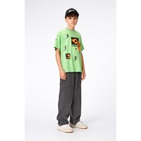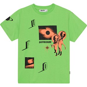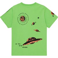 Rodney är en grön t-shirt, med mönster framtill, i 100% ekologisk bomull. Mönstret är ett 2-färgat grafiskt collage-stil mönster i orange och svart, med UFO och alien tema. Rodney har rund hals med ribbkant och en oversized passform. Detta plagg har en oversized passform. Önskar man en mer normal passform, rekomenderar vi att man tar en mindre storlek än man brukar. Detta gäller också, om barnet är mallen två storlekar.