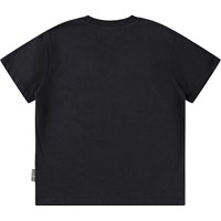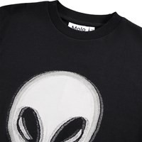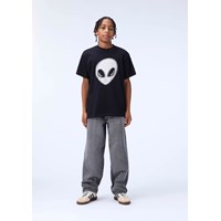 Svart T-shirt i mjuk ekologisk bomull med korta ärmar och en ribbad halsringning. T-shirten har en oversize passform med ett broderat utomjordiskt ansikte på framsidan.