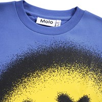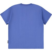 Blå T-shirt i mjuk ekologisk bomull med korta ärmar och en ribbad halsringning. T-shirten har en oversize passform med ett spraymålat leende och smältande ansikte.
