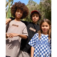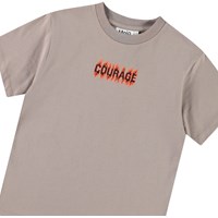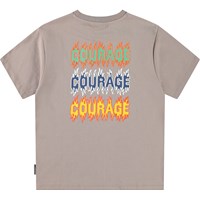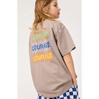 Ljusbrun t-shirt i ekologisk bomull med korta ärmar och ribbad halsringning. T-shirten har en lös passform med den eldiga och färgglada texten 'Courage' skriven på framsidan och baksidan.