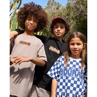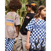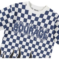 Vit- och blårutig t-shirt i ekologisk bomull med korta ärmar och ribbad halsringning. T-shirten har en lös passform och ett mönster som refererar till motocrossvärlden, tillsammans med texten 'Courage' och svarta lågor längst ner.