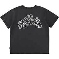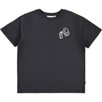 Svart T-shirt i ekologisk bomull med korta ärmar och ribbad halsringning. T-shirten har en lös passform med vit brodyr.