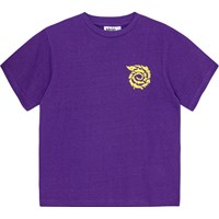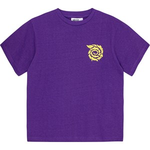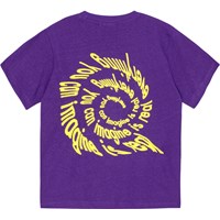 Lila T-shirt i ekologisk bomull med korta ärmar och rund hals med ribbad kant. T-shirten har en oversized passform och ett placerat tryck både fram- och baktill. Det gula texttrycket bildar en spiral med orden "Everything you can imagine is real". Den har en mindre version på framsidan, och en stor på baksidan.