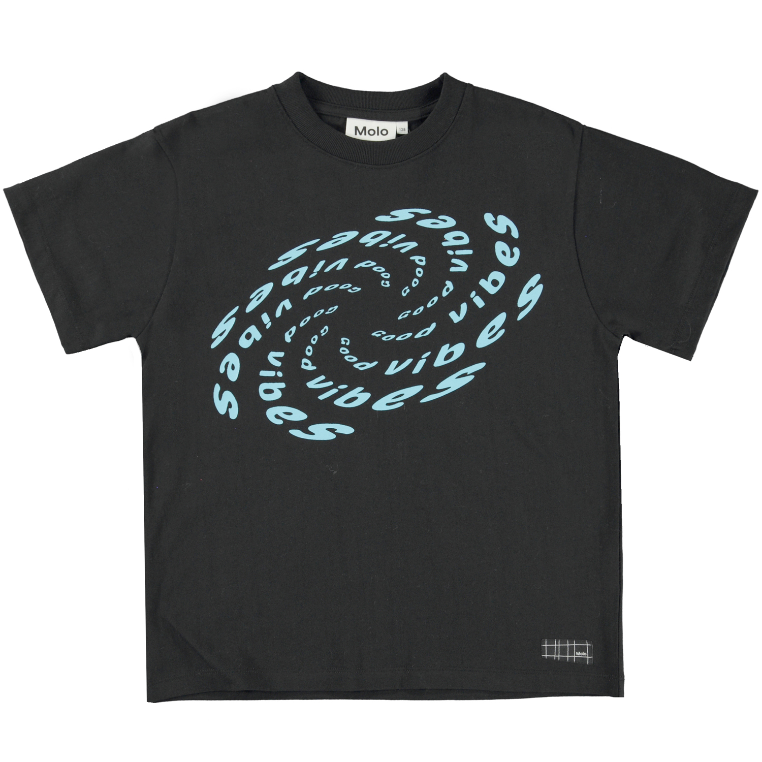 Rodney är en svart t-shirt med texten ´Good Vibes´ i blå, som bildar ett mönster både fram och bak. T-shirten har en oversized och lös passform.