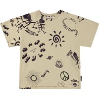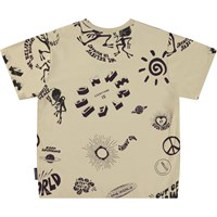 Beige t-shirt med svart mönster. Här ses element från utvalda kollektoner så som dansande rymdväsen, skinande sol, alla planeter, leenden, bankande hjärtan, peacetecken och glada svampar. Vilken fest! Denna t-shirt är tillverkad i 100% ekologisk bomull, har korta ärmar, rund hals med ribbkant och en oversized passform.