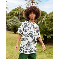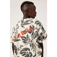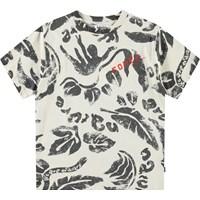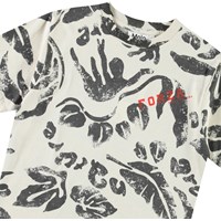 Off-white t-shirt i ekologisk bomull med korta ärmar och ribbad halsringning. T-shirten har en lös passform med ett grått mönster av löv och texten 'We are nature', samt orange text 'Forza'.