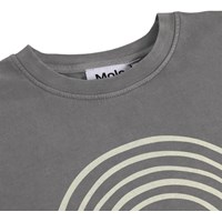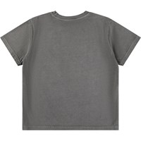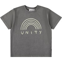 Grå T-shirt i ekologisk bomull med korta ärmar och ribbad halsringning. T-shirten har en lös passform med en beige regnbåge och texten Unity.