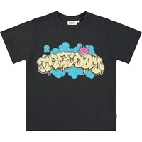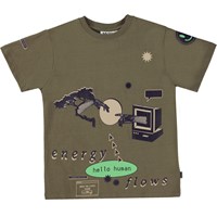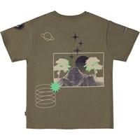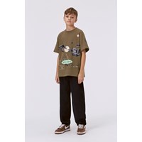 Brun t-shirt med mönster i svart, beige och grön. Mönstret är ett grafiskt collage som handlar om den suddiga linje, som kan uppstå mellan den digitala och verkliga världen. Elementen i mönstret är inspirerade av datorgrafik, t.ex. pop-up fönster, 3D teckningar och riktiga foton av träd och andra grafiska element som ikoner och text. Denna t-shirt är tillverkad i 100% ekologisk bomull, har korta ärmar, rund hals med ribbkant och en oversized passform.