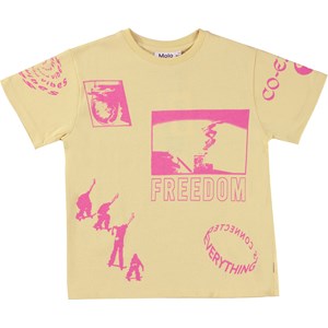 Gul t-shirt med rosa mönster inspirerat av skateboard miljön. Här har man använt grafiska eement som foton, grafiska streck, symboler och små bitar av text som tillsammans bildar ett grafiskt collage i två toner. Denna t-shirt är tillverkad i 100% ekologisk bomull, har korta ärmar, rund hals med ribbkant och en oversized passform.