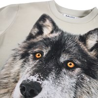 Beige långärmad tröja i mjuk ekologisk bomull med ribbad halsringning. Tröjan har en lös passform med en mörk och en ljus varg.