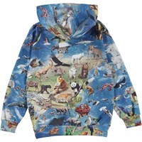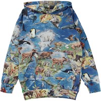 Romo är en blå luvtröja med jordens kontinenter och alla djur som som lever där, både i vatten och på land. Romo har känguruficka och ribbkant vid handleder och höfter.