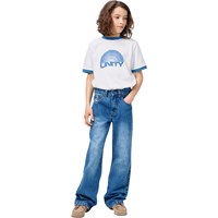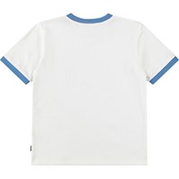 Vit T-shirt i ekologisk bomull med korta ärmar och blå ribbade kanter vid halsen och ärmarna. T-shirten har en lös passform med mönster på framsidan och texten Unity.