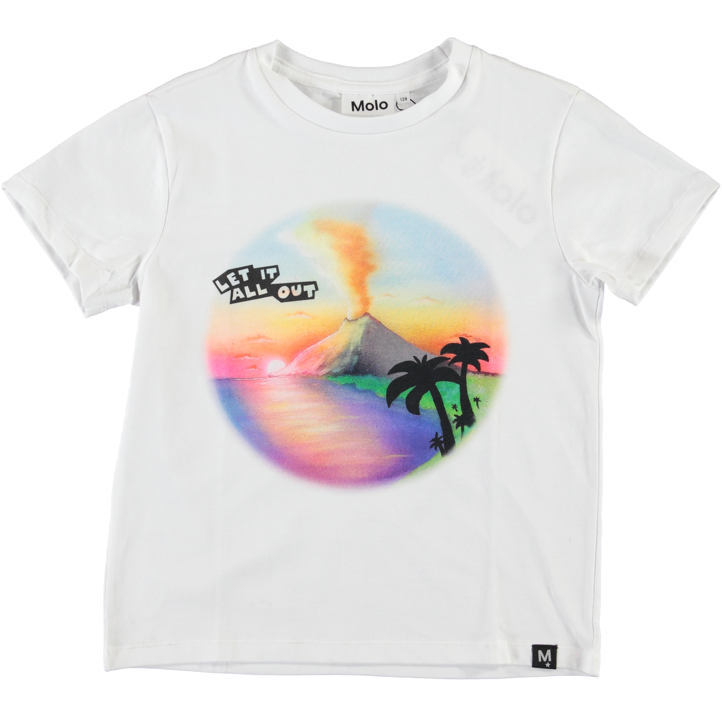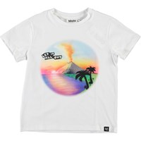Roxo är en vit t-shirt med färgrikt tryck av ett vulkanutbrott. Roxo är i 100% bomull och har korta ärmar.