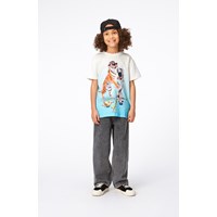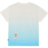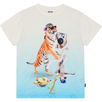 Roxo är en vit och turkos t-shirt med mönster fram- och baktill, i 100% ekologisk bomull. Mönstret är coolt och roligt, med 5 roliga djur som visar hur man breakdansar, komplett med boombox mm. På en övergående bakgrund som går från offwhite till turkosblå. Om du tittar bak på ryggen, hittar du den 5:e djurvännen. Roxo har rund hals med ribbkant och en normal passform.