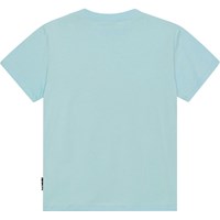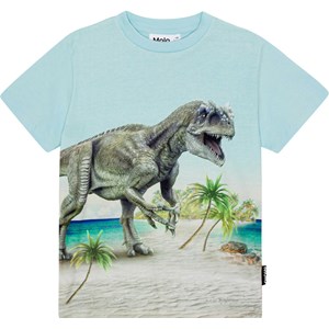 Roxo är en ljusblå t-shirt med mönster framtill, tillverkad i 100% ekologisk bomull. Här ser du en enorm rovdjursdinosurie på stranden. Vill den bada i vattnet eller slappa i sanden? Roxo har en rund hals med ribbkant och en normal passform.