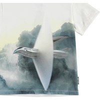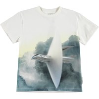 Roxo är en vit t-shirt med flygplan från framtiden som flyger genom ljudbarriären.