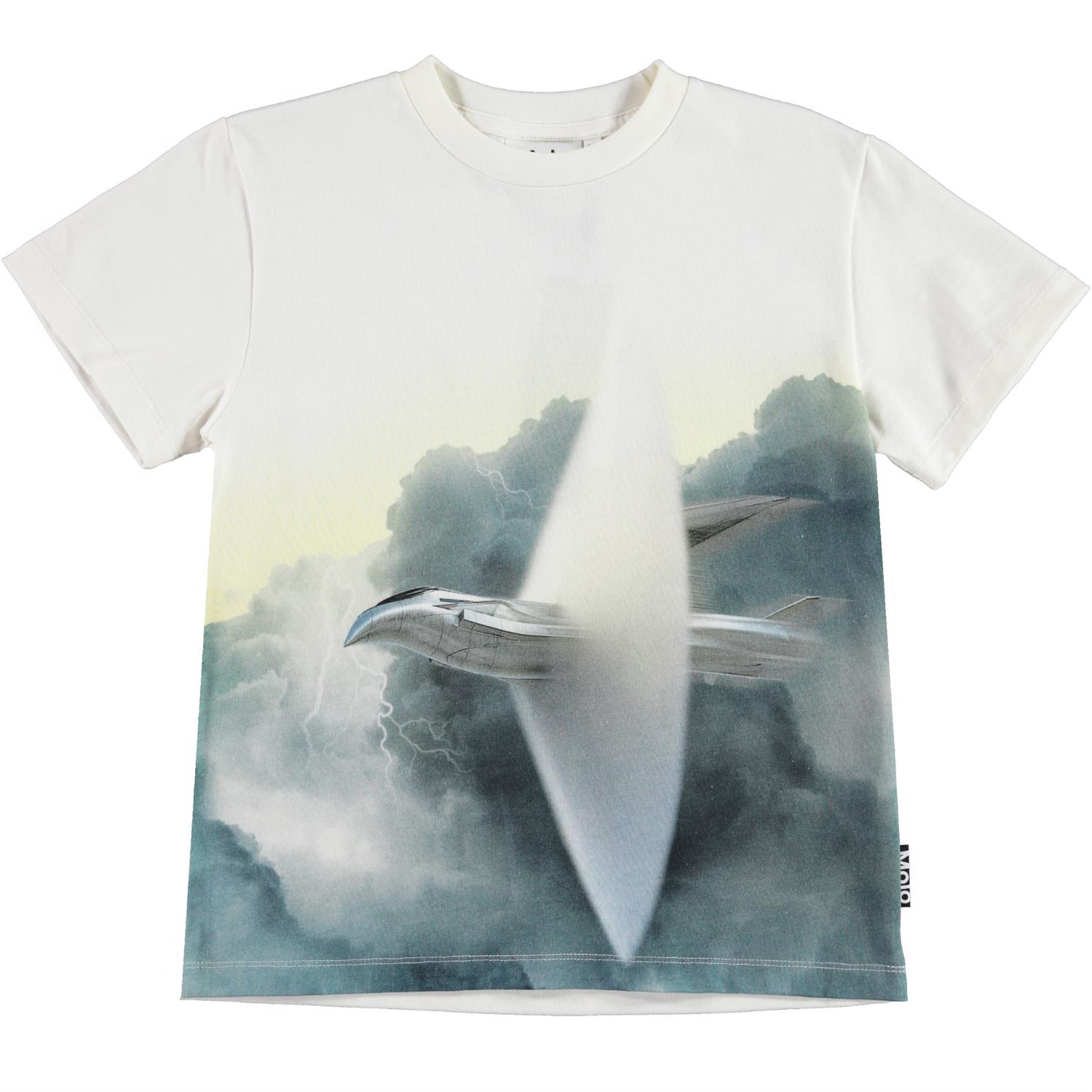 Roxo är en vit t-shirt med flygplan från framtiden som flyger genom ljudbarriären.