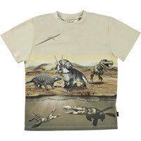 Roxo är en beige t-shirt med dinosaurier i öknen, både över- och undersida.