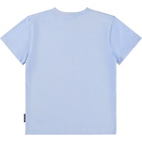 Ljusblå T-shirt i mjuk ekologisk bomull med korta ärmar och en ribbad halsringning. T-shirten har en lös passform med en tyrannosaurus och utbrottande vulkaner på framsidan.