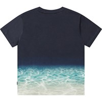 Mörkblå T-shirt i ekologisk bomull med korta ärmar, ribbad halsringning och en lös passform. T-shirten är här med mönster av en haj i havet.