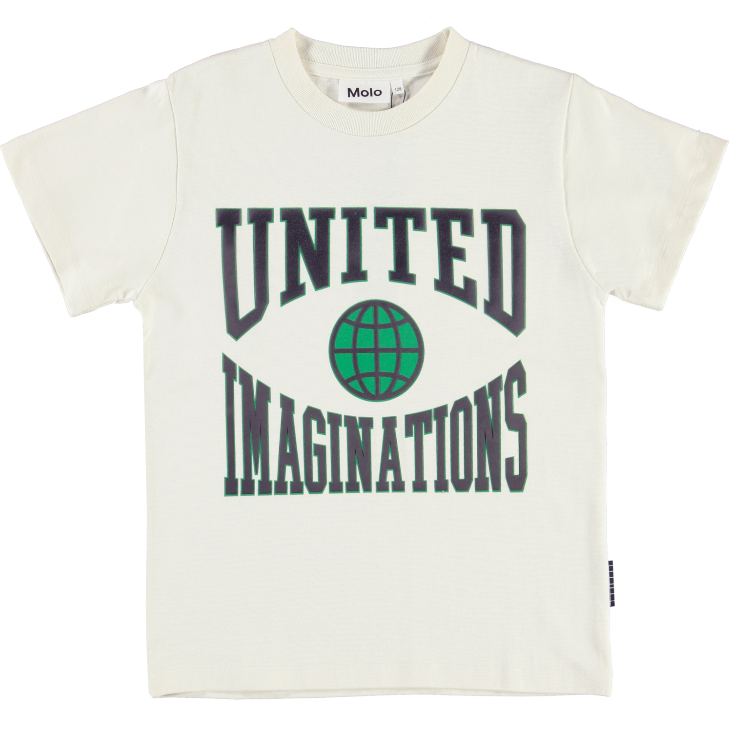 Roxo är en vit T-shirt med texten UNITED IMAGINATIONS tillsammans med en basketboll på bröstet.
