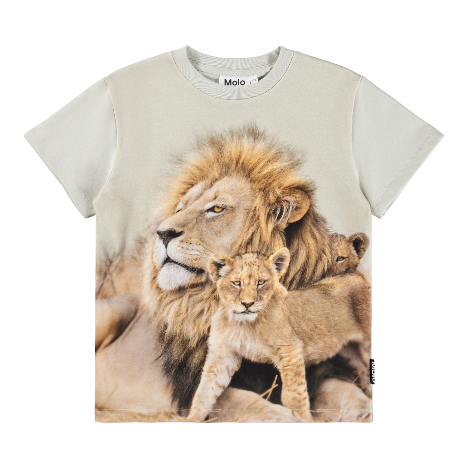 Beige T-shirt i mjuk ekologisk bomull med korta ärmar och en ribbad halsringning. T-shirten har en lös passform med en vacker lejonfamilj framtill.