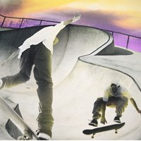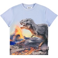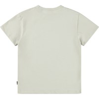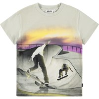 Beige T-shirt i mjuk ekologisk bomull med korta ärmar och en ribbad halsringning. T-shirten har en lös passform med pojkar på skateboard och det vackra ljuset från solen på framsidan.
