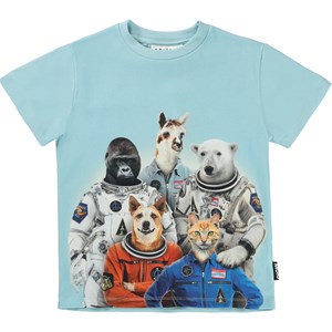 Roxo är en ljusblå t-shirt med olika djur som är redo att resa ut i rymden.