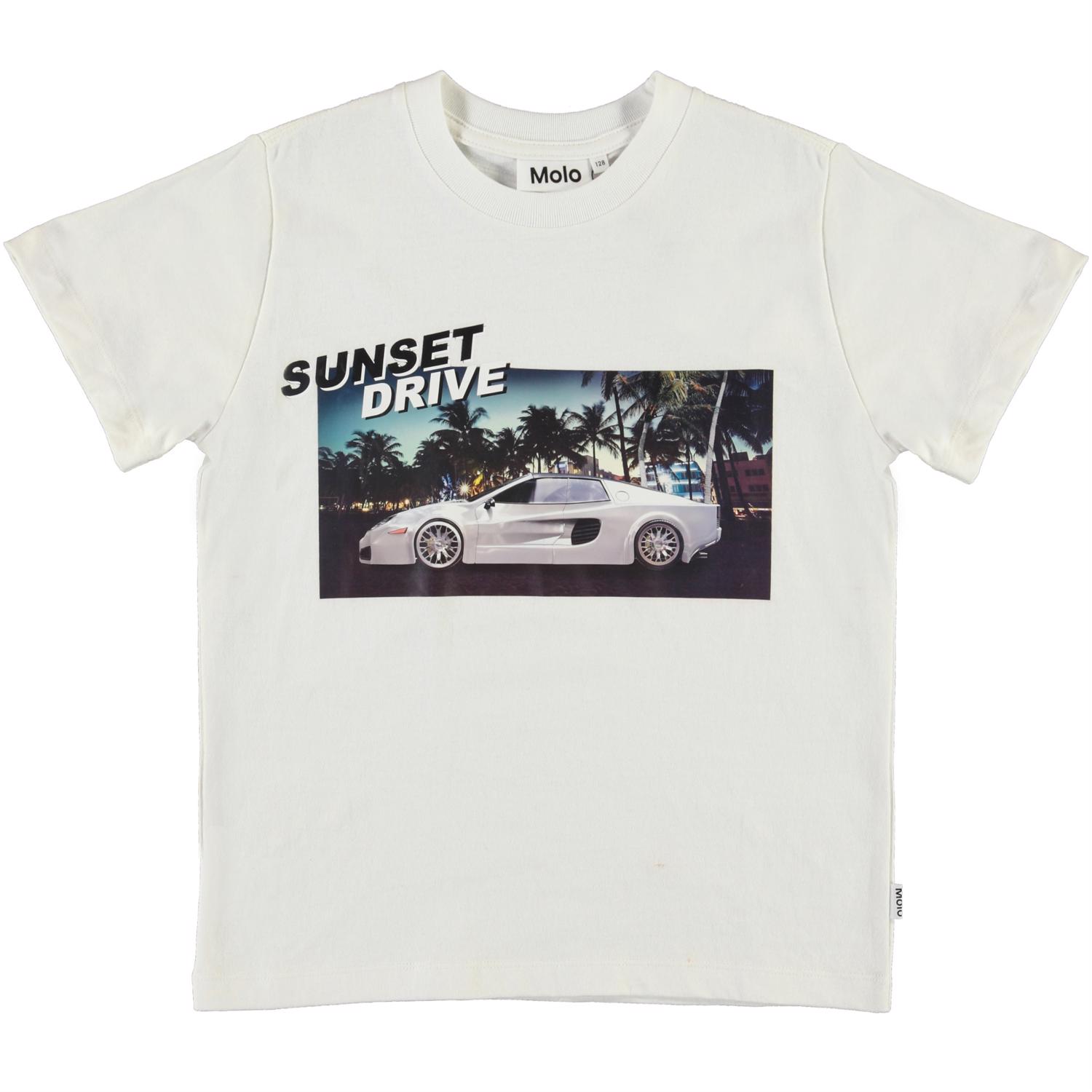 Roxo är en vit t-shirt med ett tryck av en snabb bil, palmer och texten "Sunset drive" på framsidan.