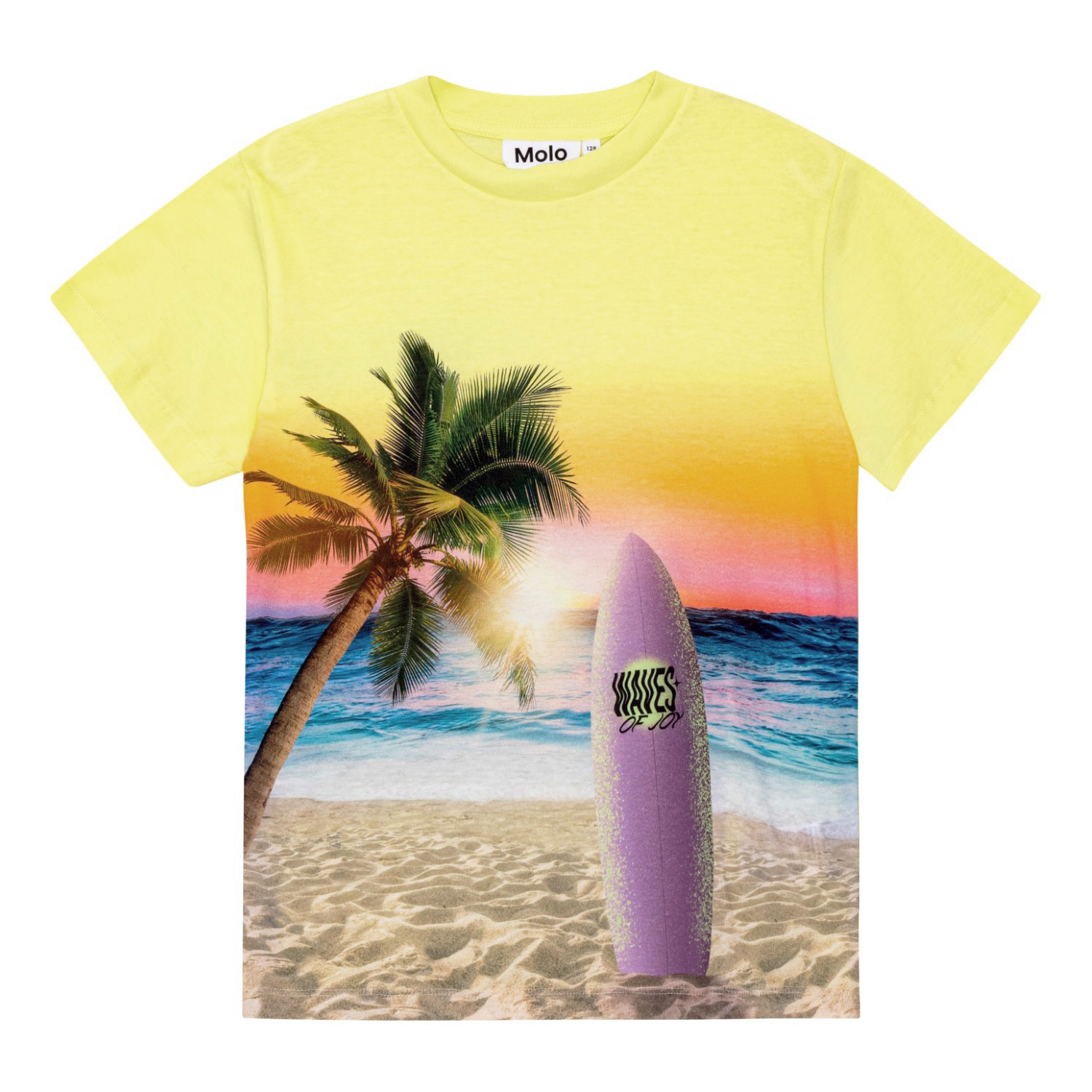 Roxo är en gul t-shrt med mönster fram- och baktill, i 100% ekologisk bomull. Här ses havet från stranden med palmer och en surfbräda i förgrunden. Roxo har en rund hals med ribbkant och en normal passform.