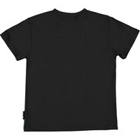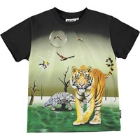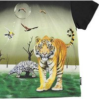 På den svarta T-shirten Roxo ytvecklar en mörklig värld sig, där träden växer i öknen och där finns både tigrar, bältdjur och flygfisk som lever sida vid sida.