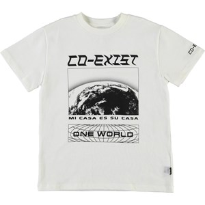 Roxo är en vit t-shirt med ett tryck av världen, samt texten "One world" och "Co-exist".