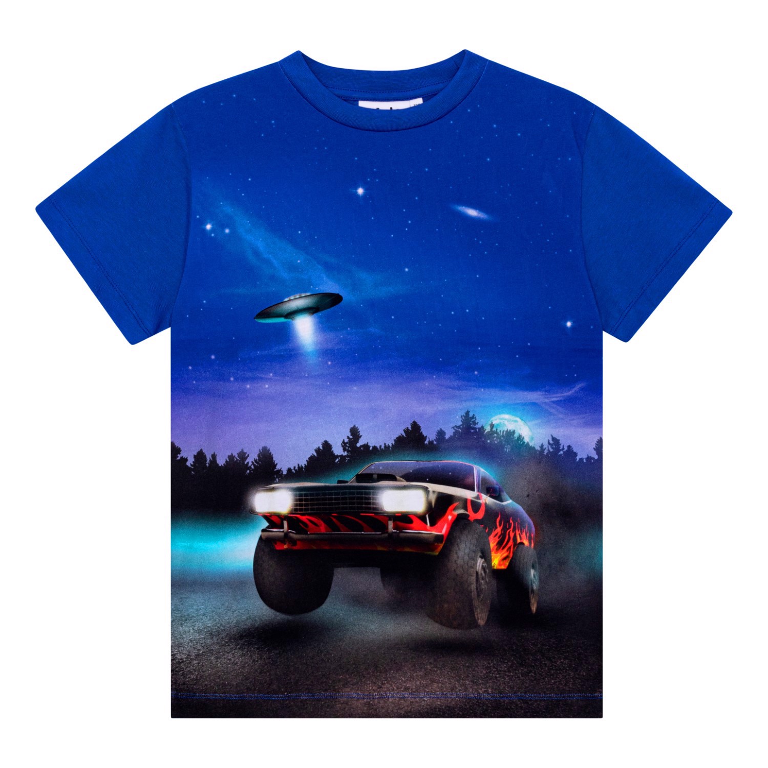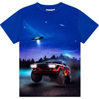 Roxo är en mörkblå t-shirt med mönster framtill, tillverkad i 100% ekologisk bomull. Här ser du en en snygg och snabb bil med eldlågor längs sidan och stora däck. Men bilen ser inte ut att köra - den ser ut att lätta från jorden! Har det något med UFOt i bakgrunden att göra? Roxo har en rund hals med ribbkant och en normal passform.