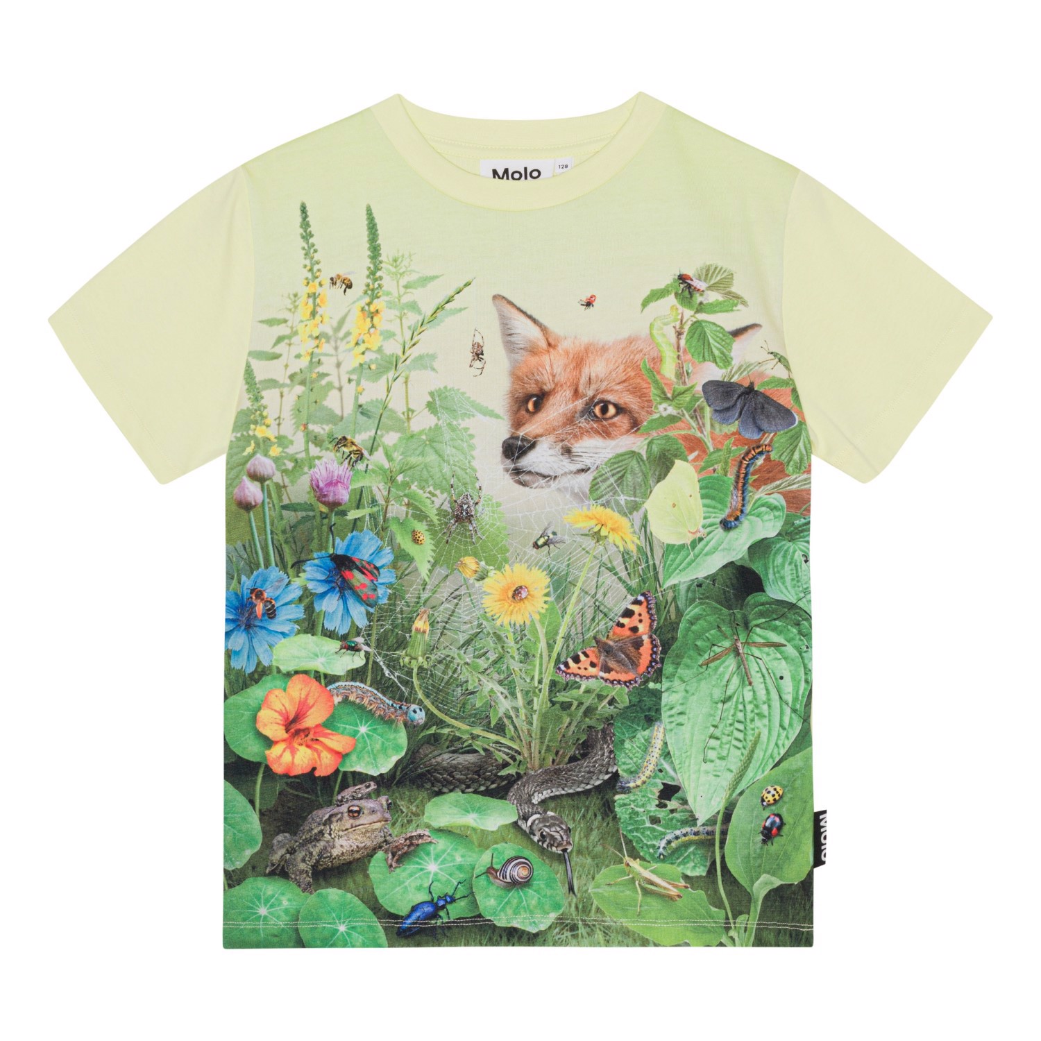 Roxo är en gul t-shirt med mönster framtill, tillverkad i 100% ekologisk bomull. På detta fantastiska mönster kan du gå på upptäcksfärd och se hur många djur du kan hitta. Visste du att ju mer du låter trädgården växa vilt, desto bättre är det för biodiversiteten? Ju mer vildvuxen trädgård - ju mer olika djur och växter. Roxo har en rund hals med ribbkant och en normal passform.