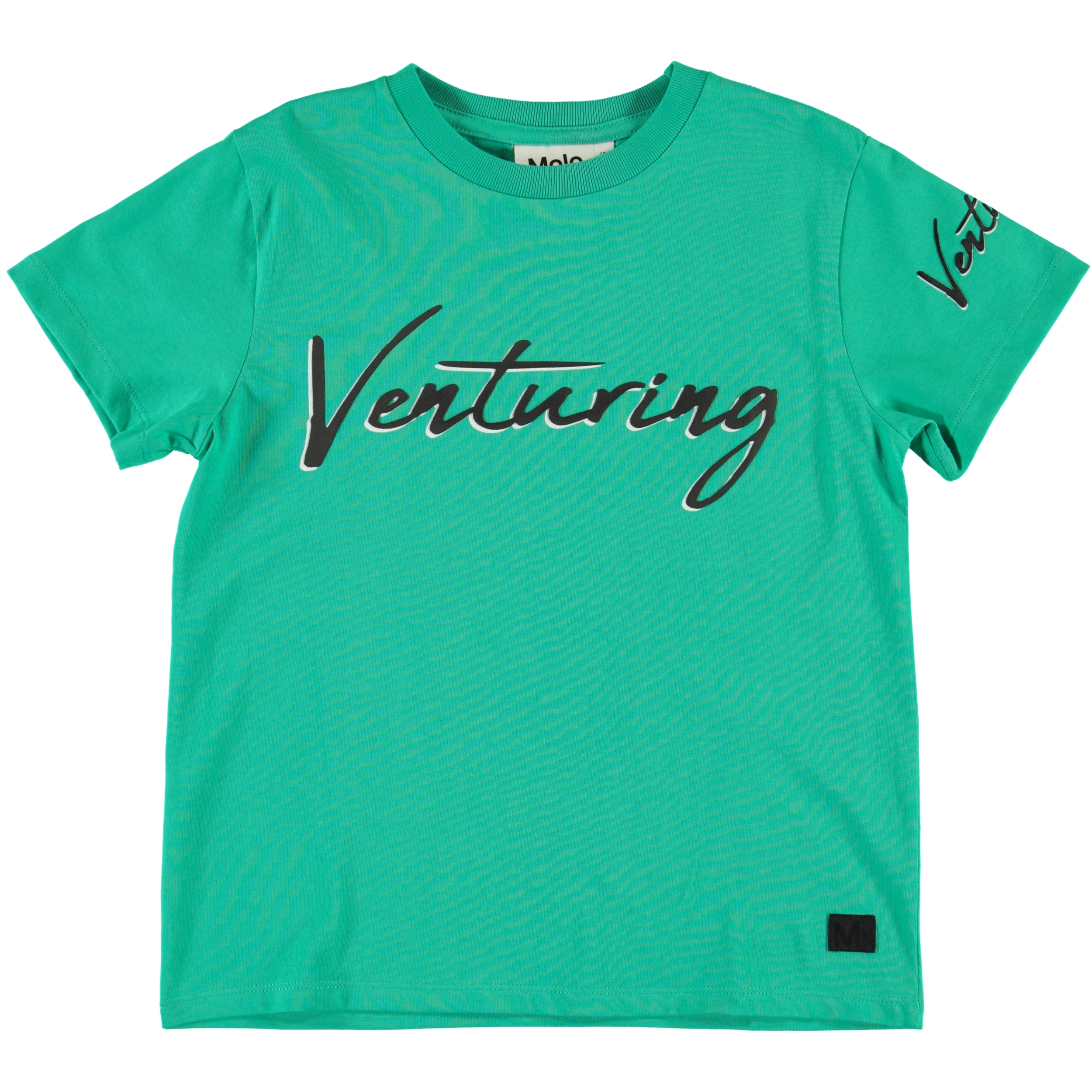 Roxo är en turkos t-shirt med trycket 'Venturing' både fram och på vänstra ärmen. Roxo är i 100% bomull och har korta ärmar.