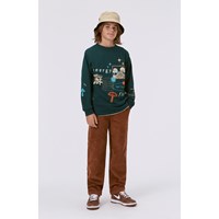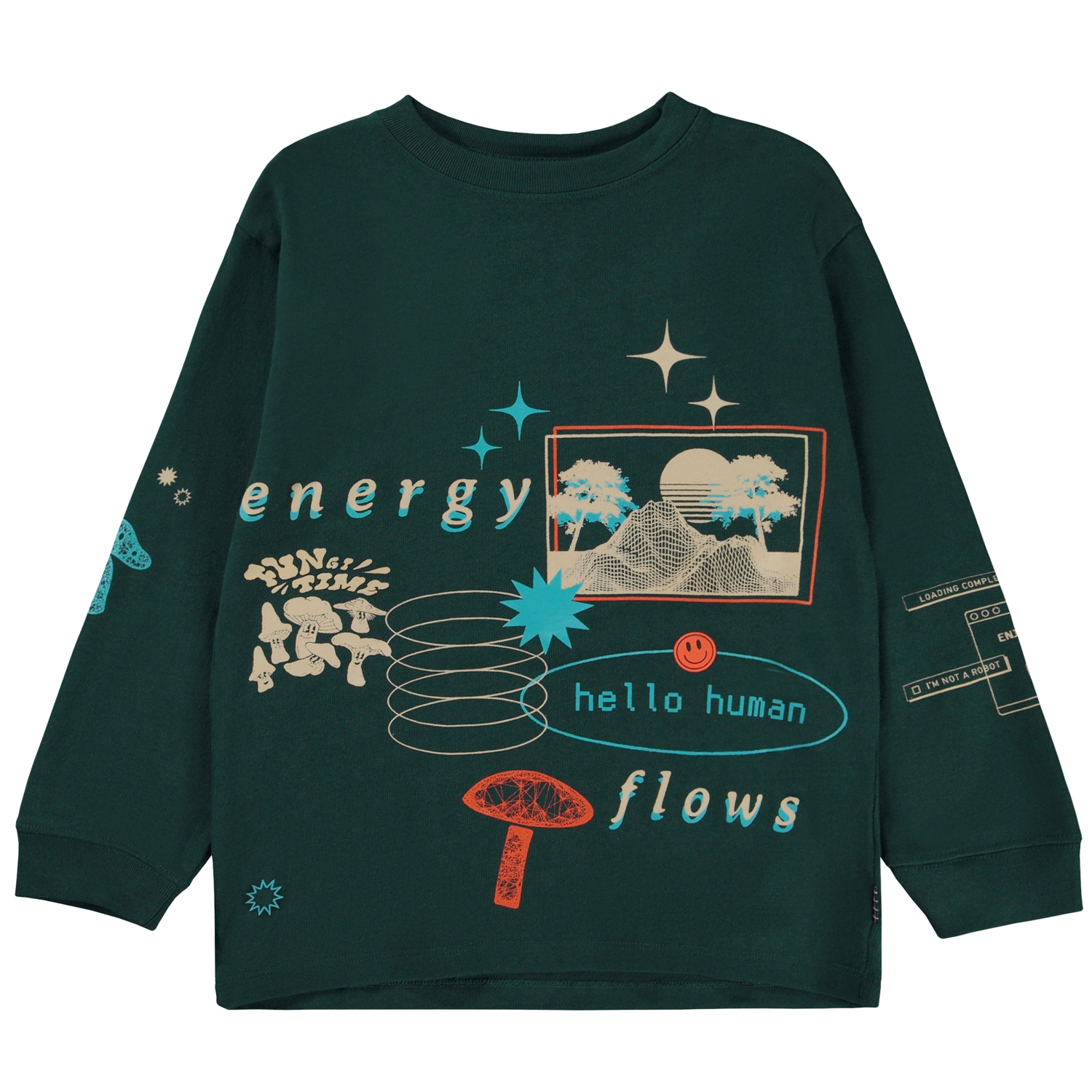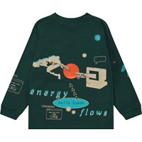 Mörkgrön långärmad t-shirt med ett grafiskt collage, inspirerat av de suddiga linjerna mellan den verkliga världen och den man kan hitta online. "Energy Flows" utforskar likheterna framför oikheterna mellan dessa två världar. Du hittar elementer inspirerade av datorgrafik som t.ex. pop-up fönster, 3D skisser och också bilder av riktiga träd. Denna långärmade t-shirt är tilverkad i 100% ekologisk bomull, har rund hals med ribbkant, ribbkant vid ärmslut och höfter, samt en lös passform.
