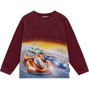 Vinröd tröja i ekologisk bomull med långa ärmar, rund hals och ribbstickad kant vid hals och ärmar. Den har en lös passform och en tryckt placering på framsidan med tre olika racerbilar, alla ivriga att vara först i mål.