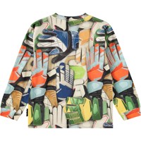 Långärmad topp i ekologisk bomull med ribbad kant på halsen och ärmarna. Toppen har en lös passform med färgglada målvaktshandskar.