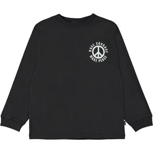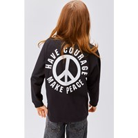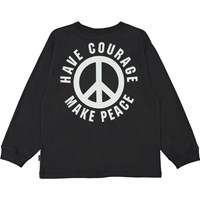 Rube är en svart långärmad t-shirt med ribbkant vid hals och handleder. På framsidan är det ett vitt peacetecken och på baksidan syns ett större version av samma.