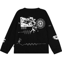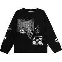 Rube är en svart tröja med vitt mönster och långa ärmar, i 100% ekologisk bomull. Mönstret är ett monokromt collage-style mönster med musikaliskt tema i form av en oldschool boombox, breakdansare och vinylskivor. Rube har rund hals, ribbkant i halsen och ärmsluten samt en lös passform.
